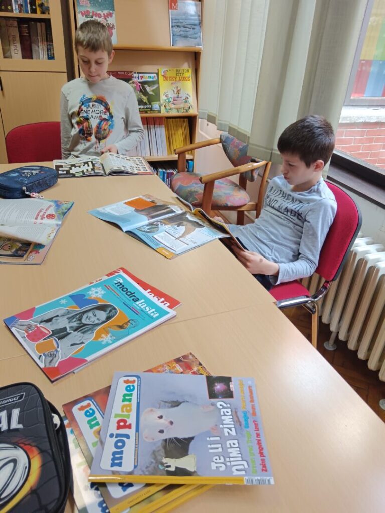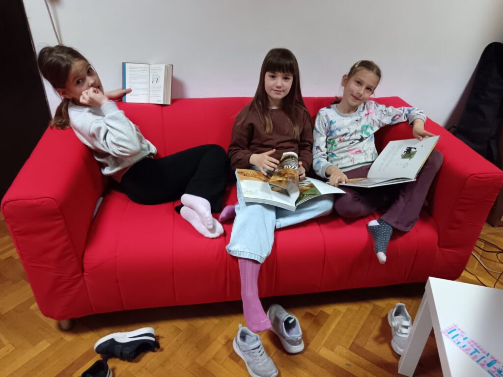 U našu školsku knjižnicu učenici rado dolaze čitati časopise, pisati domaće zadaće i čitati. U posljednje vrijeme omiljeno mjesto za čitanje je crveni kauč u koje se osobito maleni vole smjestiti, raskomotiti se i uzeti omiljenu knjigu u ruke. Ponekad je knjiga inspiracija za razgovor, postavljaju se pitanja o pojedinim riječima i frazama koje su im nepoznate pa se istražuje i Rječnik stranih riječi, a potom se definicije pojednostave i svedu na ono što je djeci poznato i blisko:)