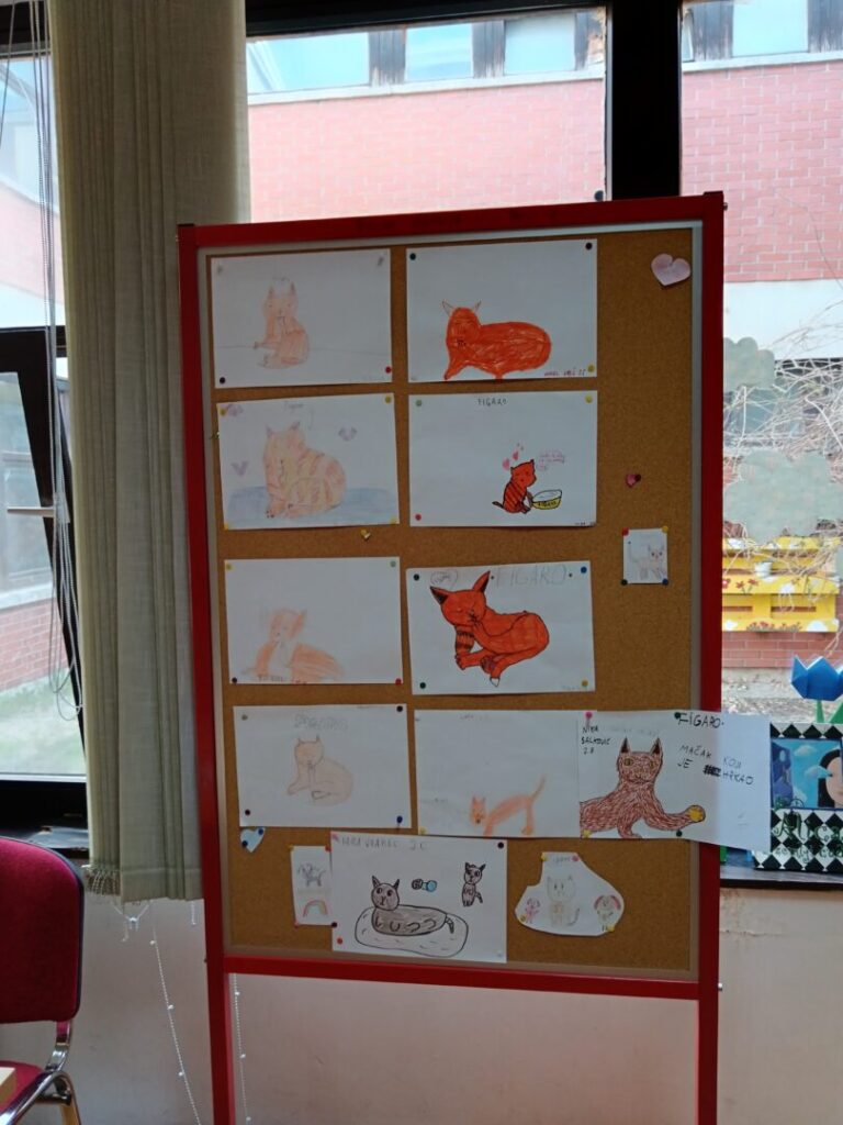 I dalje nastavljamo s čitanjem slikovnica u nižim razredima pa smo tako čitali slikovnice Jeste li Vi vještica? i Figaro, mačak koji je hrkao u drugim razredima, u suradnji s učiteljicama Tajanom Tintor i Vlastom Vrbanić Nemec. Učenici 2.b razreda napravili su u knjižnici i izložbu svojih radova nakon čitanja slikovnice o mačku Figaru:)