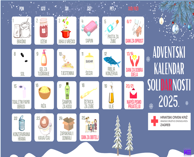 U sklopu akcije Hrvatskog Crvenog križa „Adventski kalendar solidarnosti” skupljamo namirnice za socijalnu samoposlugu, a u sklopu akcije Hrvatskog Caritasa „Za 1000 radosti” želimo ostaviti dobar trag humanosti kupujući drvene olovke.