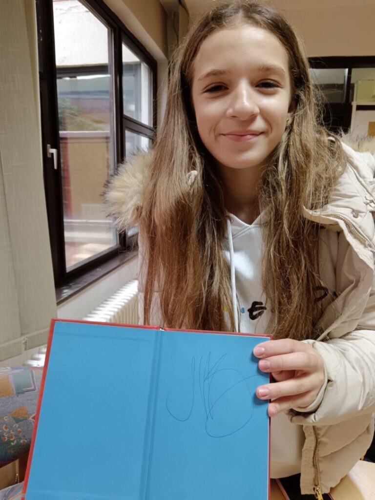Interliber je i ove godine otvorio svoja vrata stotinama izlagača, a ponuda je bila više nego impozantna. Međutim, našim je Malim knjižničarkama ponajprije bilo stalo do susreta s Jeffom Kinneyem, autorom Gregovog dnevnika, koji je taj dan držao izlaganje na Interliberu, od 10.30 do 12.00 sati. Učenice su pripremile po nekoliko Gregovih dnevnika za potpisivanje kako bi nakon autorovog izlaganja stajale u redu cijelih sat vremena za autorov potpis. No, veselju nakon toga nije bilo kraja, iako su umorne popadale s nogu! Jeff Kinney je u svom govoru otkrio koliko je dugo tražio izdavača za svoju knjigu, na koji je način ona nastajala, kako je gradio svoje likove i fabule te je u jednom trenutku pokazao i prekrasan video nastao spajanjem snimki s njegovih putovanja diljem svijeta, gdje su ga dočekivala djeca – njegovi vjerni čitatelji, s knjigama, nasmijanih lica. I kod nas je dvorana u kojoj se pojavio slavni pisac bila prepuna djece koja su bila presretna zbog prilike da slušaju jednu od najvećih zvijezda grafičkih romana današnjice. Nakon tog susreta učenice su još sat vremena istraživale sajam knjiga i, moramo reći, nisu se iz obilaska štandova vratile praznih ruku! Ljubiteljice knjiga, čitanja, bookmarkera, olovaka, notesa i drugih književnih delicija  opskrbile su se omiljenim mangama, stripovima, dječjim romanima koje smo na povratku kući, nakon odličnih fritula s čokoladom, pokazivale s veseljem jedne drugima.