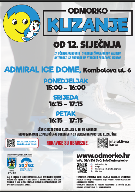 Školski sportski savez Grada Zagreba od ponedjeljka, 12. siječnja 2026. godine nastavlja sa programom slobodnog klizanja i programom slobodnog plivanja, usavršavanja plivačkih tehnika i skokova u vodu u sklopu Odmorka tijekom školske godine.
