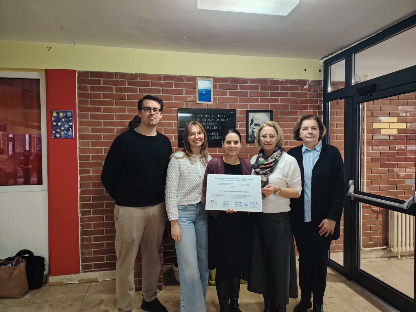 U Osnovnoj školi Gustava Krkleca svečano je uručena ploča DELF scolaire, priznanje koje potvrđuje predanost škole promicanju francuskog jezika i višejezičnosti među učenicima. Ploču je ovom prigodom predala gđa Lucile Chapiro, ataše za obrazovnu i jezičnu suradnju, koja je nedavno preuzela dužnost od g. Le Devedeca.